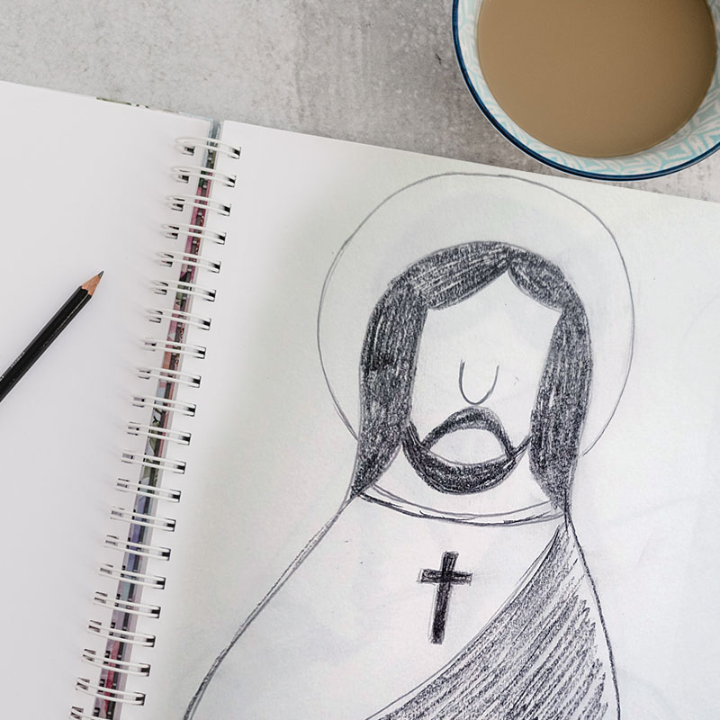 Jesus triggert mich. Schon Immer. Sterben, um wiedergeboren zu werden. Wozu der Umweg. Ständig stichelt er mit seiner Leidensgeschichte in meine Illusion vom ewigen Lebensglück; versalzt mir die Gute-Laune-Suppe. Er schafft es nicht, mir das Leiden schmackhaft zu machen. Seit kurzem sind wir in Kommunikation, in Verbindung. Es sind zarte Annäherungen. Erst nach 7 Wochen hat er seine Augen bekommen, jetzt sieht, beobachtet und beschützt er mich. Ich glaube, er liebt mich. Er hat sich Selbst gemalt.